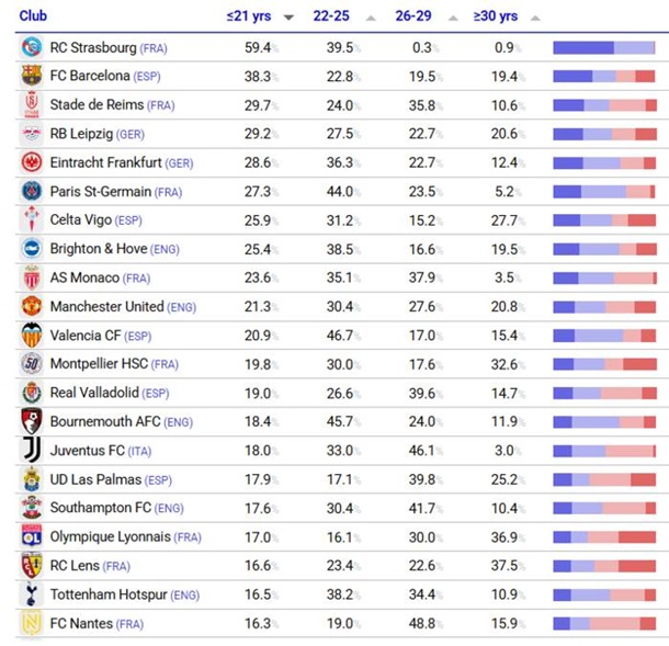 Крім того, серед команд чемпіонатів Топ-5 Європи Французький Страсбург (майже 60%) вважає більше, ніж інші у молоді, а за ним-Барселона з показником 38,3%. Єдині клуби, які не використовують гравців старше 29 років, – Челсі та Штутгарт, але якщо британці віддають перевагу молодим гравцям до 26 років (76,8%), то німці мають майже половину ігрового часу на полі, футболістів у Прем’єр -міністрі (від 26 до 29 років).